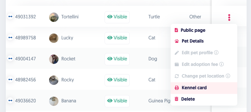 Choose between full and half pages when printing any Kennel Cards. Difference between full and half pages You can print kennel cards by using the dotted button on the "All Pets" menu. Then, select the desired option. If you choose full page mode, the kennel card will contain an 800 character pet description.