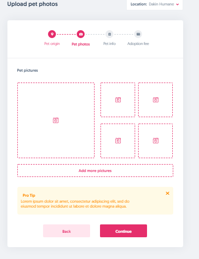 This is how pets stand out the most. Upload a few pictures of your pet to highlight his/her personality and characteristics. Great profile pictures are decisive to convert more adoption applications.