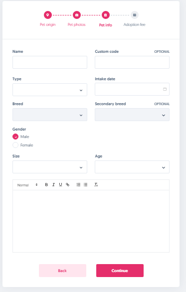 • Here you fill out all information in regards to the pet's name, type, intake date, primary and secondary breed if applicable, gender, size, age, and description. Note that the description field is a rich text editor, so make sure to put good thought into it as they are highly crucial to convert more adopters.