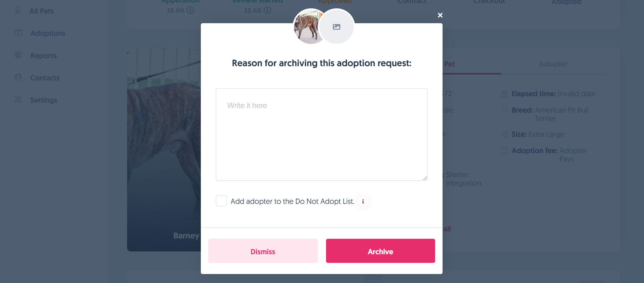 > If you accidentally Archived an Application, just reach out to us through chat or email at support@adopets.com with the name of the pet and the name of the adopter on the application you wanted to unarchive.