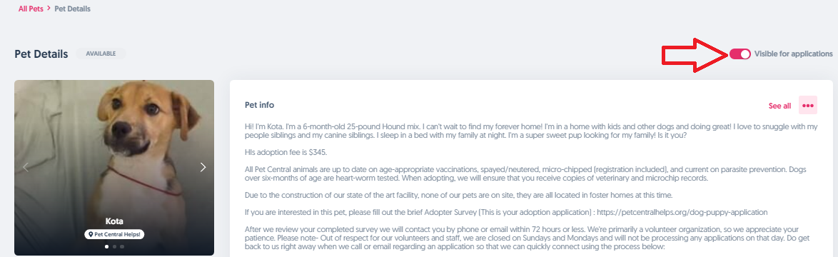 Step 5: After that is done, make sure the pet's visibility is turned on in case you'd like to have them available in your public listings.