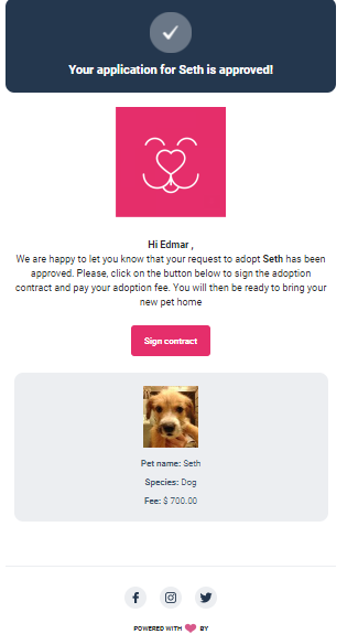 When approved for adopting a pet, for instance, you will receive an email regarding the signature of your adoption contract and payment of the pet's adoption fee, if there is any.