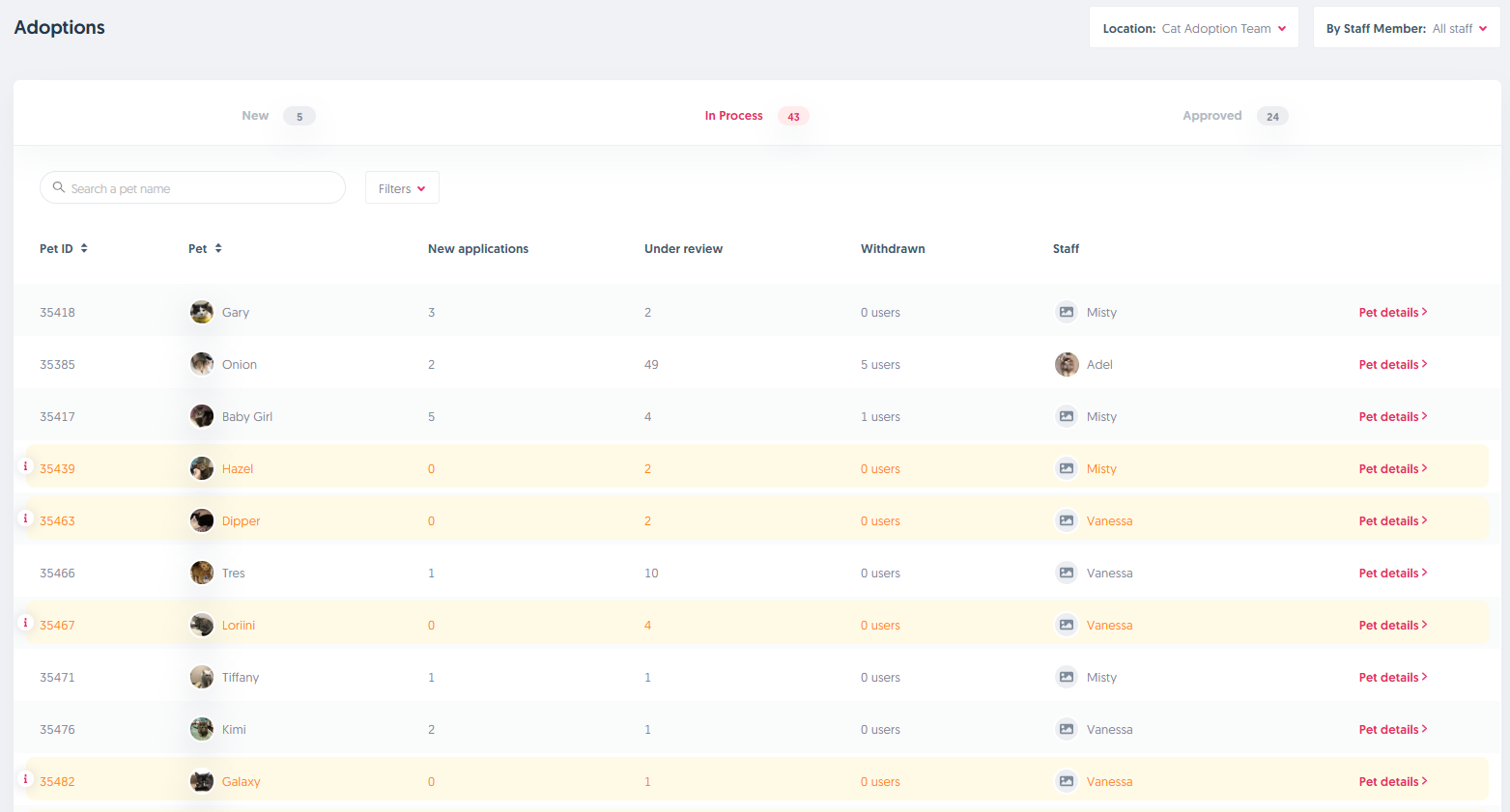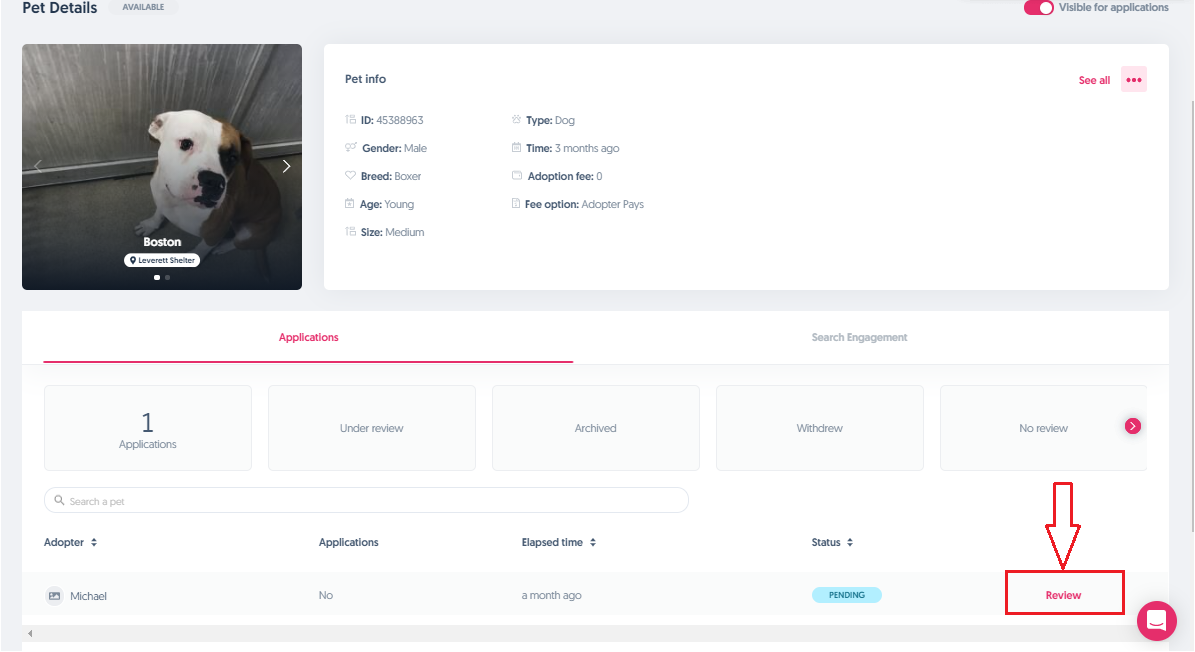 As soon as you click on Pet Details on any of those pets, it will take you to the details of the pet itself and you'll have the option to start reviewing the application by clicking the "Review" button.