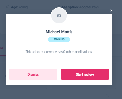 As soon as you click on Review on any of those applications, a confirmation window will pop-up to indicate ownership of the pet's application going forward. It will also show the other pets that the adopter has applied for. Once confirmed, it brings you to the Application details page to work on the actual review.